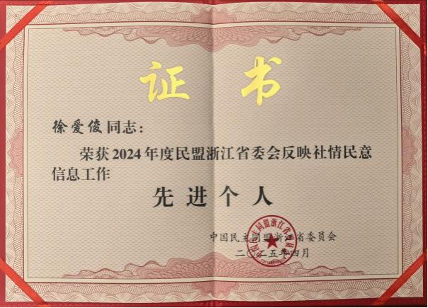 2024年,徐愛俊聚焦社會熱點,深入開展調研,撰寫了《土特產企業發展遇多重困境亟待全面完善政策體系》《完善大學生士兵退役復學優待政策》《高校實驗室“易燃易爆”安全風險亟待精細化管理》《生態修復草種缺口巨大亟待強壯“中國芯”》等4篇高質量社情民意信息,均獲民盟省委會采納使用。