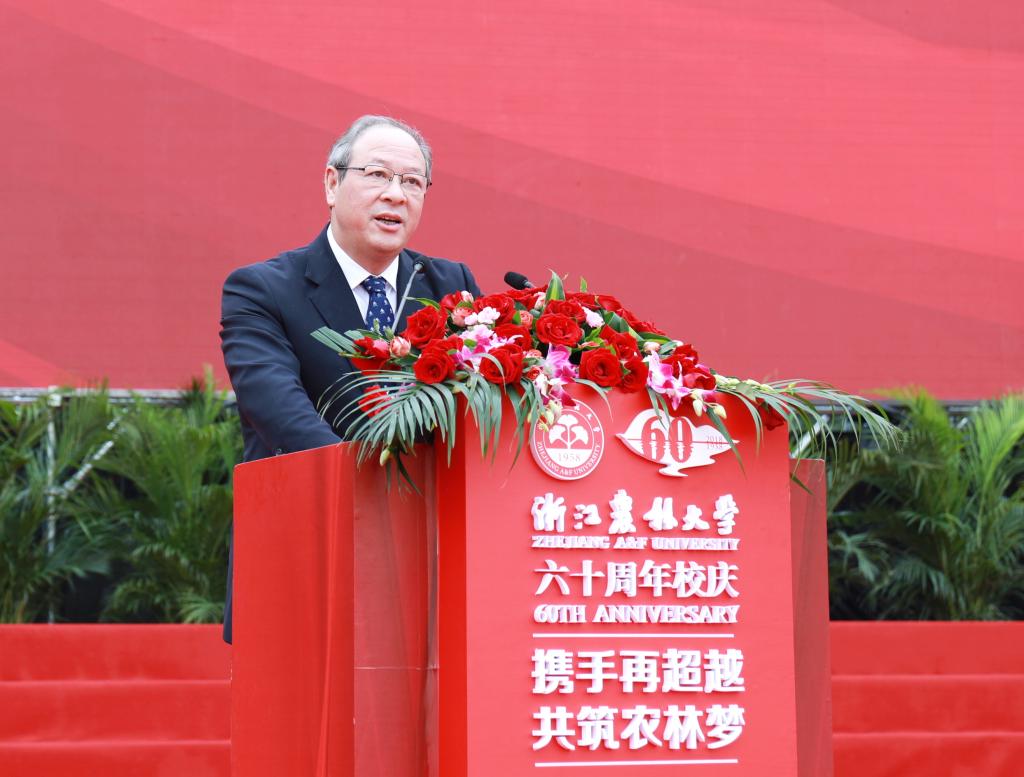 彭佳學代表浙江省人民政府向學校60華誕表示祝賀。他指出,學校始終與國家共命運,與時代齊奮進,辦學水平不斷提高,綜合實力顯著增強,培養了一大批高素質人才,取得了一大批高水平科研成果,為我省“三農”事業、生態文明建設和經濟社會發展作出了重要貢獻。省政府將一如既往地支持學校的發展,為學校改革發展創造更好條件、提供更優服務。他希望學校服務鄉村振興,對標國家“雙一流”大學,聚焦高水平內涵建設,深化教育教學改革,厚植學科專業優勢,構建高水平的人才培養體系,提升科研創新和社會服務能力,早日建成更有活力、更高水平、更富特色的高水平大學,為實施鄉村振興戰略,推進浙江“兩個高水平”建設作出新的更大貢獻。