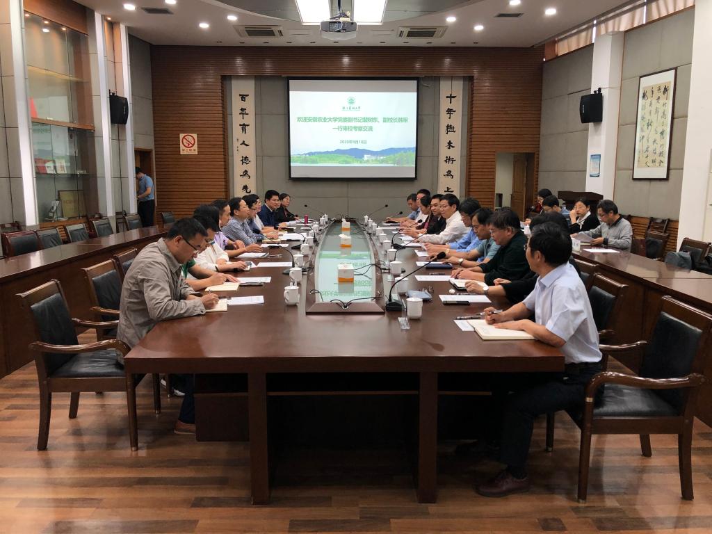 9月18日,安徽農業大學黨委副書記裴樹東、副校長韓軍一行來校考察調研,雙方就干部管理、學科建設、儀器設備管理等工作展開深入交流,校黨委副書記馮尚申陪同調研。組織部、學工部、研工部、教務處、設備處、建管處等部門相關負責人參加交流活動。