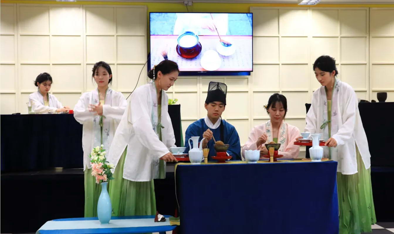 據了解,師生們呈現了“漢儀(茶禮)” “唐風(煮茗)”“宋韻(點茶)”等沉浸式茶藝創意,展示了中國茶文化悠久而原生的審美境界,于不動聲色中展現了中國人哲理與生活溶為一盞的寫意技能。其中,以宋代茶文化為靈感的“宋韻”,以千年前宋人的點茶技藝,配合“焚香”“插花”“碾茶”,重現文人“斗茶”“分茶”的雅致場景,展現了中華美學的含蓄與幽邃。