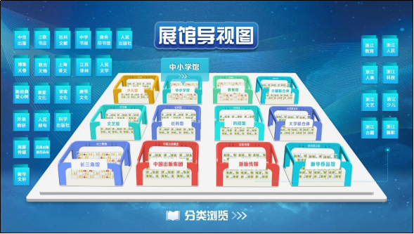 c.特設浙江出版集團、中國出版集團、長三角聯(lián)合館、聯(lián)合推薦館、學校裝備館、之江新華薦品館及五大類館區(qū),并標志重點書目。