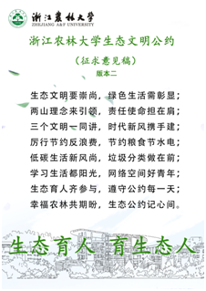 為深入學(xué)習(xí)宣傳貫徹習(xí)近平生態(tài)文明思想,全面貫徹學(xué)校第三次黨代會(huì)精神,落實(shí)“生態(tài)育人、育生態(tài)人”工程,讓生態(tài)理念貫穿學(xué)校思政工作各方面和人才培養(yǎng)全過(guò)程,學(xué)校擬出臺(tái)浙江農(nóng)林大學(xué)“生態(tài)文明公約”。經(jīng)前期醞釀,初步篩選,擬定兩版征求意見(jiàn)稿,請(qǐng)全體師生踴躍參與投票,共同選出浙江農(nóng)林大學(xué)“生態(tài)文明公約”。