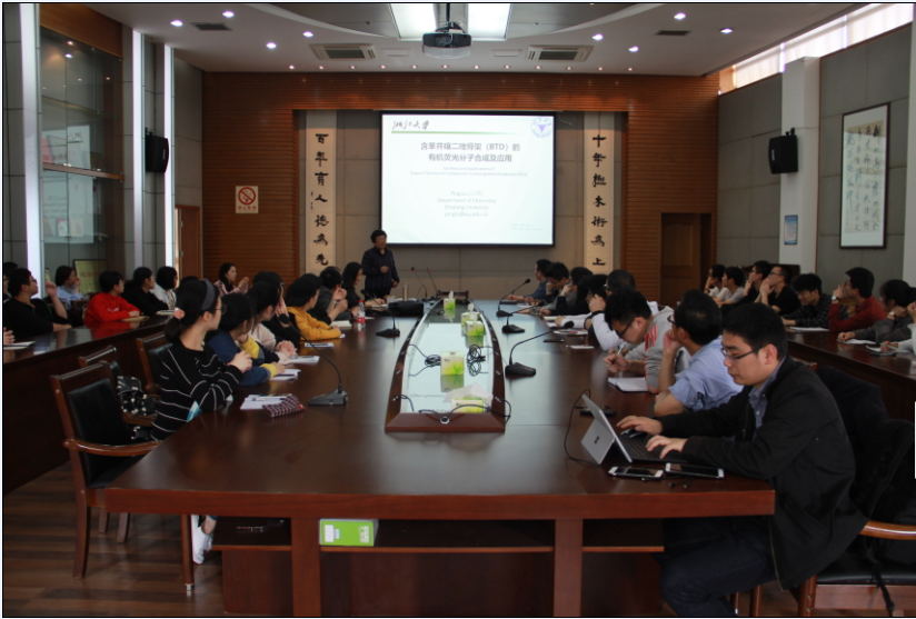 3月30日下午,浙江大學博士生導師、中國化學會理事、浙江省化學會常務理事、秘書長呂萍教授應邀作題為“含苯并噻二唑骨架的有機熒光分子合成及應用”學術報告。理學院相關負責人主持報告會,有關學科師生參加。