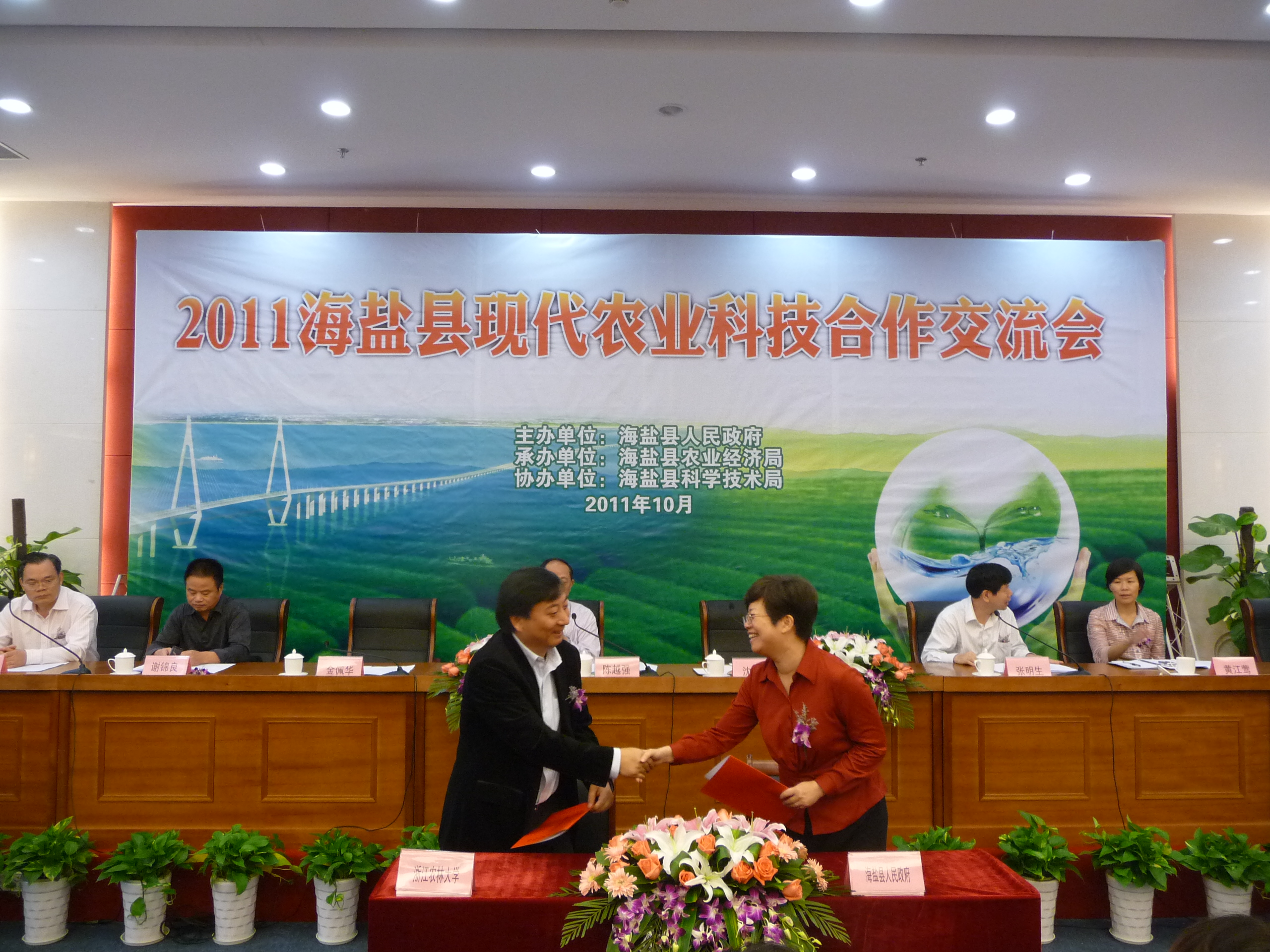 浙農林大新聞網訊 10月13日,由海鹽縣人民政府主辦、海鹽縣農業經濟局承辦、海鹽縣科學技術局協辦的“2011海鹽縣現代農業科技合作交流會”在海鹽召開。我校副校長金佩華帶隊,社會合作處、農業與食品學院、林業與生物技術學院相關領導、專家參加了此次會議。