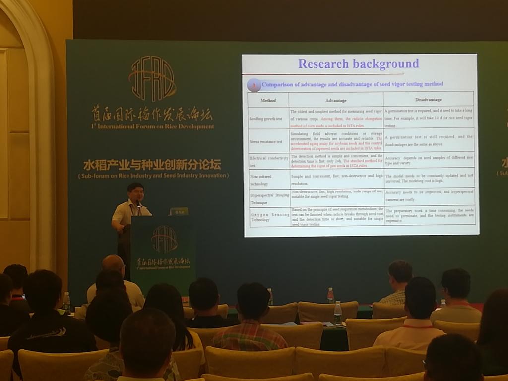 大會共設置了四個分主題:水稻資源與種質創新、稻作栽培與綠色生產、水稻產業與種業創新、稻作文化傳承與創新發展。在“水稻產業與種業創新”分論壇上,我校趙光武教授應邀作了“氧傳感技術和高光譜技術在水稻種子活力檢測中的應用”的學術報告,系統介紹了氧傳感技術和高光譜技術的原理及其在水稻種子活力檢測方面的研究進展,并圍繞水稻種子質量的快速無損檢測與分選技術進行了總結和展望,獲得了與會專家及同行的高度關注。