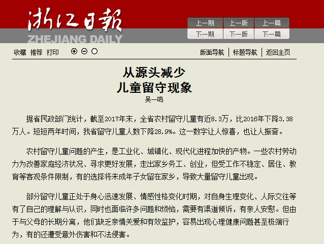 5月29日,《浙江日報》刊登我校“三農”發展智庫(浙江省農民發展研究中心)吳一鳴評論文章《從源頭減少兒童留守現象》。