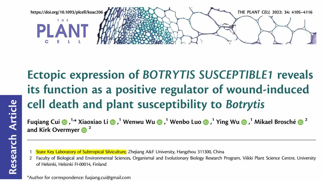 近日,國家重點實驗室崔富強副教授以“Ectopic expression of BOTRYTIS SUSCEPTIBLE1 reveals its function as a positive regulator of wound-induced cell death and plant susceptibility toBotrytis”為題發表在國際權威學術期刊《The Plant Cell》(中科院1區Top,IF5-yr=12.796)。該研究揭示植物細胞死亡和易感的調控機制,并闡明了細胞死亡調控因子MYB108的功能。崔富強副教授為論文第一作者和通訊作者,國家重點實驗室為第一單位。