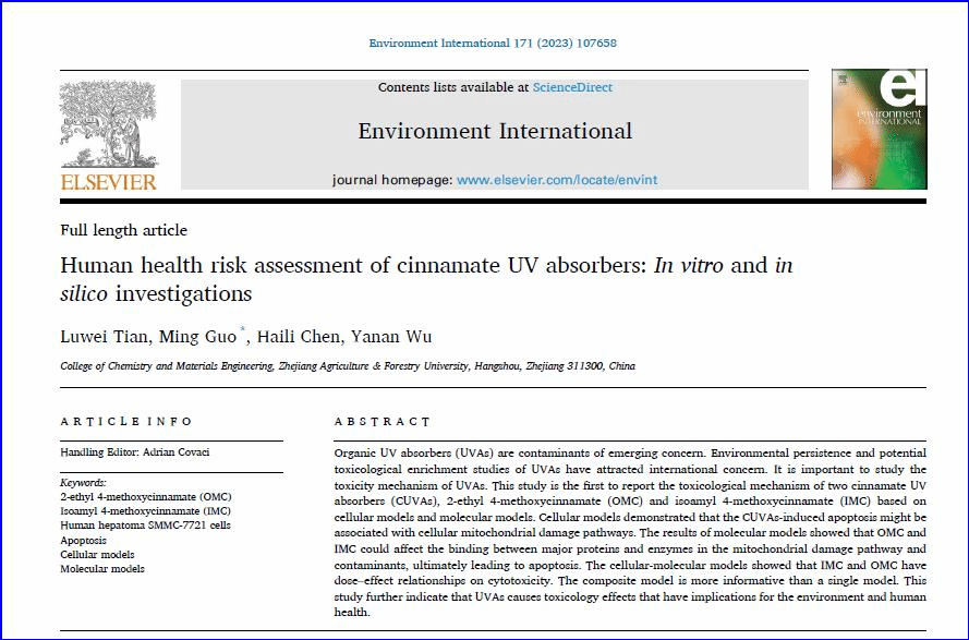 近日,化學與材料學院碩士研究生田路偉同學在國際知名期刊Environment International(中科院一區,IF: 13.352)發表了題為“Human health risk assessment of cinnamate UV absorbers:in vitroandin silicoinvestigations”的研究論文。論文通過研究Cinnamate類紫外吸收劑對人體細胞影響機制的研究,對Cinnamate類紫外吸收劑對生態環境的危害及康養效應的有害影響進行評析。