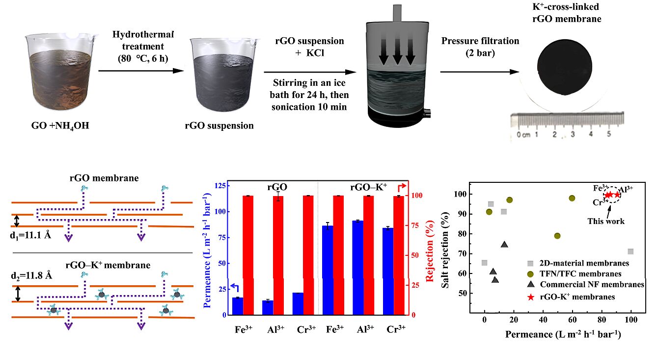 近日,我校光機電工程學院研究團隊在國際知名刊物《Journal of Membrane Science》(影響因子7.183),以“Robust reduced graphene oxide membranes with high water permeance enhanced by K+modification”為題在線發表了最新研究成果。該論文第一作者為我校光機電工程學院2019級碩士研究生楊如杰,光機電工程學院教師樊艷博士為共同第一作者,陳均朗副教授和陳亮教授為共同通訊作者。該論文得到了國家自然科學基金委、浙江省自然科學基金委、浙江農林大學校科研發展基金的資助和支持。該工作通過探究水合K+離子對氧化石墨烯膜通道大小調控的物理機理,實現了對高價態離子超高水通量的截留,具有良好的工業化應用前景。