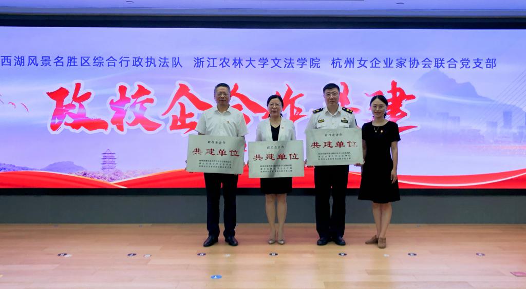 7月6日,為推進政產學研合作項目落地,文法學院與杭州西湖風景名勝區綜合行政執法隊、杭州市女企業家協會聯合黨支部等共同開展“政校企”三方合作。西湖風景名勝區綜合行政執法隊黨委書記鄭超、杭州市女企業家協會副會長、協會聯合黨支部書記章曉鈁以及文法學院院長魯可榮、黨委書記朱紅東等相關負責人出席會議。