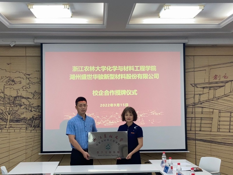 9月15日,化材學院負責人、高分子專業科技服務團隊教師代表與湖州盛世華駿新材料股份有限公司負責人在國家木質工程中心舉行了校企合作授牌儀式。