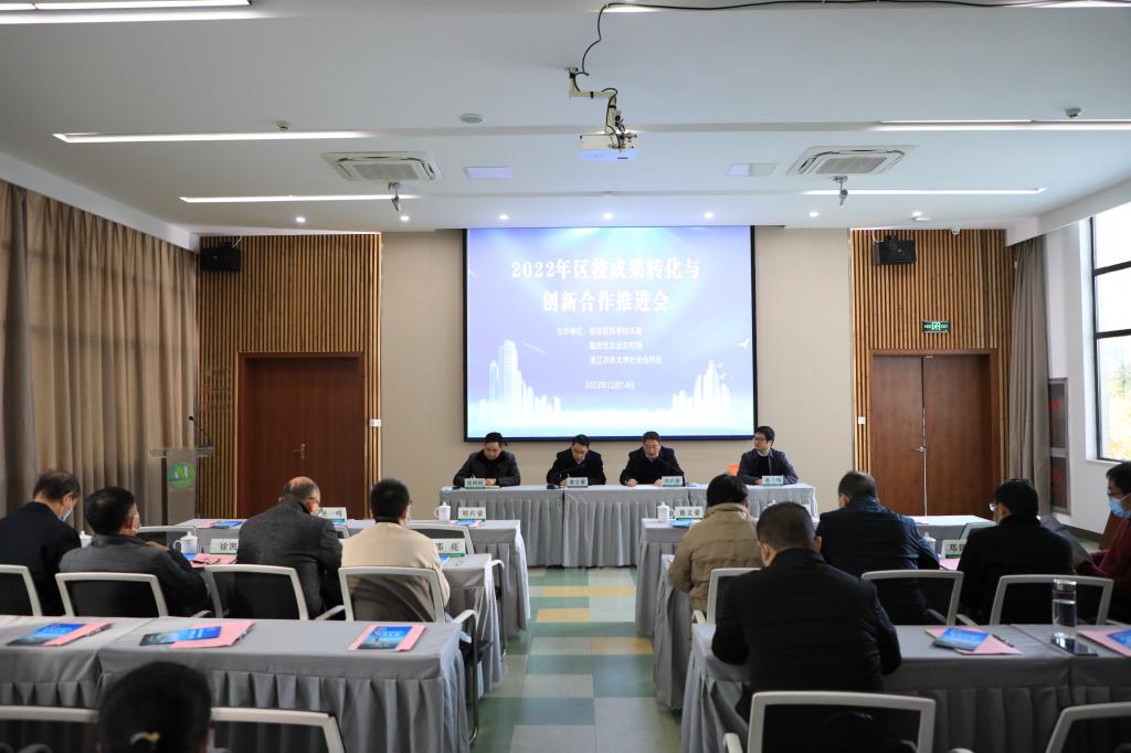 12月14日,由臨安區科學技術局、臨安區農業農村局和我校社會合作處聯合主辦的2022年區校成果轉化與創新合作推進會在臨安農創園舉行。區科技局和農業農村局相關領導,我校合作處負責人等出席會議。