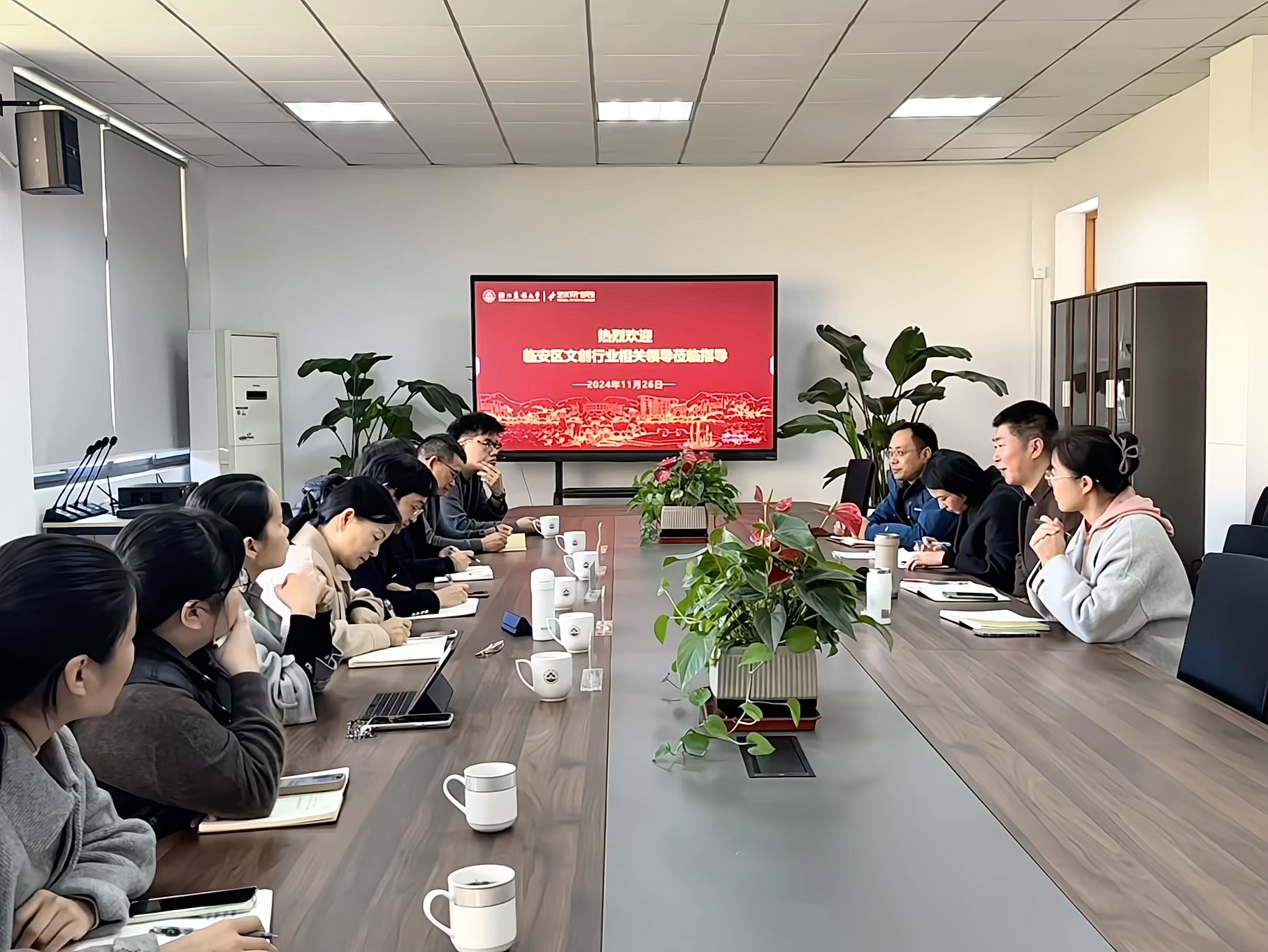 11月26日下午,臨安區委宣傳部文創辦主任潘曉霞一行來藝術學院考察交流。藝術學院院長陳思宇、黨委書記黃曉芳等領導參加交流。